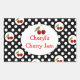 Etiqueta de conserva divertida feita a preto com bolinhas brancas e cerejas vermelhas suculentas. Um grande círculo branco, no meio, é decorado com cerejas, no topo, e texto vermelho personalizado abaixo. Personalize este rótulo fofo para os seus produtos cereja.