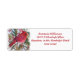 Etiqueta de endereço da Bird Cardinal Vermelha com sotaques pretos, empoleirada num galho holandês verde e marrom coberto de neve cercado de groselhas vermelhas
