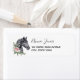 Etiquetas de endereço com uma bela ilustração de uma cabeça de cavalo preto com um rico de ornamento floral ao lado do pescoço. Pintura de animais elegante e elegante.