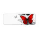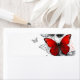 Bando de borboletas voadoras, realistas, vermelhas e pretas em fundo branco com gotas de tinta.