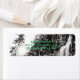 Uma fotografia a preto e branco de uma cascata numa parede de pedra, com árvores na linha da serra, e o sol brilhando na crista da cena da paisagem. Imagem Copyright ©2019 Kimberly J Tilley. www.zazzle.com/developingnature