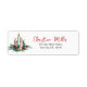 Esta design do endereço de retorno mostra uma cena festiva de velas de Natal cercadas por um belo buquê de flores de férias. O texto é escrito em negrito, tipografia personalizada numa combinação impressionante de vermelho e preto, acrescentando ao sentimento generalizado de alegria e celebração.
