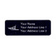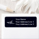 Uma silhueta branca de um cão a trenós num fundo estrelado. Adicione seu nome e endereço.