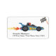 Um design divertido com um carro de corrida azul e uma bandeira de controlo. Personalizar para aniversários ou qualquer ocasião. Elementos de coordenação disponíveis.
