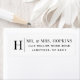 Um simples rótulo de endereço de devolução com monograma de inicial única clássica e nome da família e endereço.