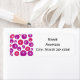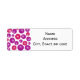 Estas etiquetas de endereço de devolução têm um design moderno de meados do século de círculos roxos e rosas com explosões de estrelas brancas neles, todos em um campo branco.