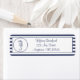 Este design apresenta um fundo de listras azuis e brancas do marinho. Um cavalo marinho azul cercado por pontos azuis fica à esquerda de uma área de modelo para você adicionar seu nome e endereço.