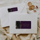A borda esquerda desta elegante e moderna etiqueta de endereço de retorno de convite de casamento apresenta uma cor d'água preta, borda agitada com falso brilho dourado. O texto personalizável combina um script de escrita manual dourado e fontes de impressão em fundo roxo profundo.