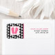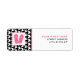 Etiqueta de endereço de retorno com ilustração de um par de chinelos cor-de-rosa à esquerda sobre um fundo houndstooth com caimento rosa. Personalize com seu nome e endereço à direita.