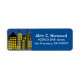 Ilustração urbana de prédios da cidade com fundo azul da noite. Personalize esta etiqueta com o seu nome ou endereço. Para alterar o plano de fundo azul para outra cor, clique em Personalizar.