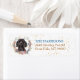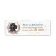 O lado esquerdo destas etiquetas de endereço de retorno apresenta uma imagem de uma coroa de primavera em cores de rosa mole, azul, dourado, verde e creme. No centro está uma imagem de um Cachorro de Poodle de cinzas. Pequeno confete de ouro dá um brilho sutil ao fundo. Seu texto personalizado está em ouro azul e marrom à direita.