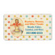 Etiquetas de padaria personalizadas e divertidas. Um marfim com um padrão retrorado de aqua, laranja e bolinhas amarela é o fundo para esta etiqueta de na moda, com uma área de texto de borda recortada colorida em marfim, com gráficos retrorados engraçados de um cozinhar feminino surpreendido. Personalize o texto em laranja e azul para a sua empresa de comidas.