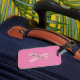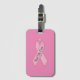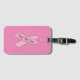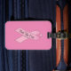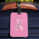Etiqueta cor-de-rosa projetada para Mês de consciência do câncer de mama, outubro, cartão de informação "Find the Cure" no verso, visto que a bagagem acaba perdida e encontrada.