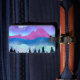 Uma paisagem de abstrato com cores e texturas únicas mostrando uma cena de montanha com árvores e neblina névoa em tons de roxo, azul, lacre e ciano.