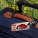 Esta etiqueta de bagagem tem uma joaninha fotografada.