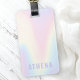 Etiqueta de bagagem de mesa com um fundo de padrão de arco-íris pastel macio e seu nome em roxo claro.
