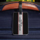 Na parte de trás, você pode adicionar seu nome e número de telefone, o que pode ser útil caso sua bagagem se perca. Na frente, o padrão tem faixas verticais. Da esquerda para a direita, as listras são uma espessa faixa preta, uma fina faixa vermelha escura, uma espessa faixa metálica, uma fina faixa vermelha escura e uma espessa faixa preta. Você pode adicionar seu monograma na parte inferior da faixa que parece metal escovado. Todo o texto é preto e pode ser editado.