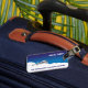 Uma etiqueta de bagagem mostrando um avião nas nuvens com céu azul.