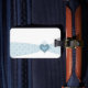 Uma etiqueta elegante para viajar com uma fita azul clara com pequenos sotaques cardíacos.