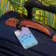 Uma bela foto de um bando de pássaros voando através de um céu iluminado pela lua sobre uma floresta em uma etiqueta de bagagem personalizável. Você pode personalizar o texto no verso para o ajustado das suas necessidades!