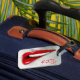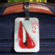 Esta etiqueta de bagagem tem lábios nela e diz "beijo" nela.