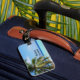 Bibliotecário aposentado, palmeira na praia, etiqueta de bagagem.