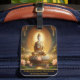 Buda ouro irradia paz em meio a um lago tranquilo de lótus, com luz suave iluminando a paisagem serena. Lave o verde e montanhas distantes enquadram esse momento sagrado de contemplação, convidando reflexão e harmonia interior no crepúsculo.