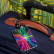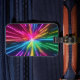 A etiqueta de bagagem do Cosmic Burst apresenta uma explosão dinâmica de matizes neon que pulsam para fora do centro.
