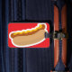 Uma ilustração estilizado de um cachorro quente com mostarda em um fundo vermelho.