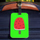 Etiqueta de Bagagem de Cápsula de Melancia projetada por Nisha Prabhu CuteHomeGifts. Bloqueio de cor do picolé de melancia branca em branco vermelho e verde com a ilustração a cores da água das sementes de melancia preta em fundo verde. Para a criança (ou criança em você!) Faça seu pop de bagagem com seu novo e único rastreador de bagagem de picolé!