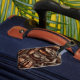 Fecho das cabeças e caudas de um jacaré entalhadas intrinsecamente numa superfície de couro, com uma fivela de cinto e padrões florais detalhados.