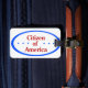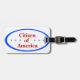 This luggage tag displays a badge stating "Citizen of America" with three blue stars on each side of the text and a blue rim around the edge.