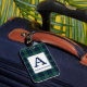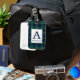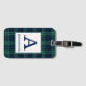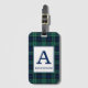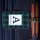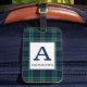 Etiqueta de bagagem com o tartan familiar de Clan Abercrombie, um padrão tradicional de xadrez escocês de 1805 em azul-real escuro, preto e verde-floresta com sotaques brancos. Personalize com seu sobrenome e nome inicial em uma placa de cor clara para facilitar a legibilidade.