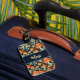 Etiqueta de bagagem personalizada com uma ilustração de cogumelos retrorreflectores, flores de vintage em cores de azul escuro, laranja e bege.