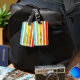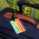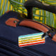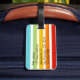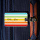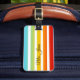 Uma etiqueta de bagagem elegante com um padrão festivo de banda colorida do arco-íris na sua própria cor de fundo.