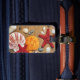 Mala divertida de verão, com uma fotografia de conchas coloridas numa praia arenosa. Personalize o texto personalizado preto, no verso, para as próximas férias.