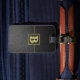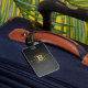 Etiqueta de bagagem monográfica personalizada com gráfico de couro de grão preto perfurado. Na moda de mistura feminina e masculina. Uma fonte elegante monográfica que você pode personalizar em uma cor dourada que parece impressionada no couro. Tão simples, mas tão elegante. Personalize seu monograma rubricado na frente. Personalize o seu nome e número de telefone no verso.