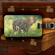 Etiqueta de bagagem com um leopardo numa savana herdada. Bonita para grandes amantes de gatos e para aqueles que amam safari e viagem de aventura.