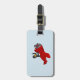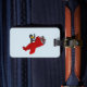 Etiqueta de bagagens com design, ilustrada com um pinguim que voa num plano vermelho; ilustrada por Radka Kavalcova/MaxiHarmony