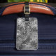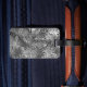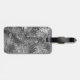 Etiqueta de bagagem com um desenho abstrato legal de "aspecto metálico líquido" e formas de borbulhamento em tons de cinza de prata. Pode ser usado como um fundo para o seu próprio texto, imagens e ideias. Observe que esta é uma imagem de arte digital impressa, ela não brilha ou contém metal real.