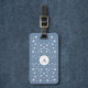 Etiqueta de bagagem azul empoeirada, com uma letra monofilizada, um padrão de potência do ventilador e ornamentos florais. Use-o quando for viagem para férias ou trabalhar. É personalizável com a letra inicial, o nome e as informações de contato!