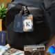 Uma bonito etiqueta de bagagem personalizada decorada com flores de pêssego sobre um elegante fundo azul.