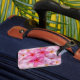 Bonito etiqueta de bagagem de plumeria rosa. slot de cartão de visita na parte traseira.