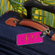 Etiqueta de bagagem de viagem. Uma etiqueta de bagagem é usada para identificar facilmente sua mala caso ela se perca durante o viagem, pois contém suas informações de contato, como nome, número de telefone e endereço, permitindo que alguém chegue a você se encontrar sua mala separada de você.