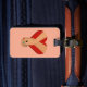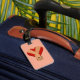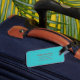 Etiqueta de bagagem de viagem. Uma etiqueta de bagagem é usada para identificar facilmente sua mala caso ela se perca durante o viagem, pois contém suas informações de contato, como nome, número de telefone e endereço, permitindo que alguém chegue a você se encontrar sua mala separada de você.