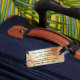 Uma etiqueta de viagem, elegante e de aparência rica.