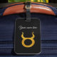 Dourado símbolo de astrologia Taurus, cor de fundo personalizada e nome Etiqueta de bagagem com correia de couro