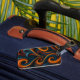 Abstract pattern featuring a stunning three-dimensional relief effect, where deep, velvet-blue waves interlock with fiery orange and rust-red curls. The composition uses the intense, natural tension of complementary colors (blue and orange) to create a visual symphony that seems to swirl.