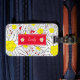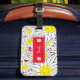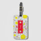 Uma etiqueta de bagagem vermelha com um padrão edelweiss em negrito. Personalize com seu nome. Procure o titular do passaporte correspondente.