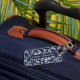 Etiqueta de bagagem monográfica, concebida por medida personalizada, com o nome/monograma personalizado do cheio, com a cor aquosa do eucalipto, na frente, e informação de contato no verso.